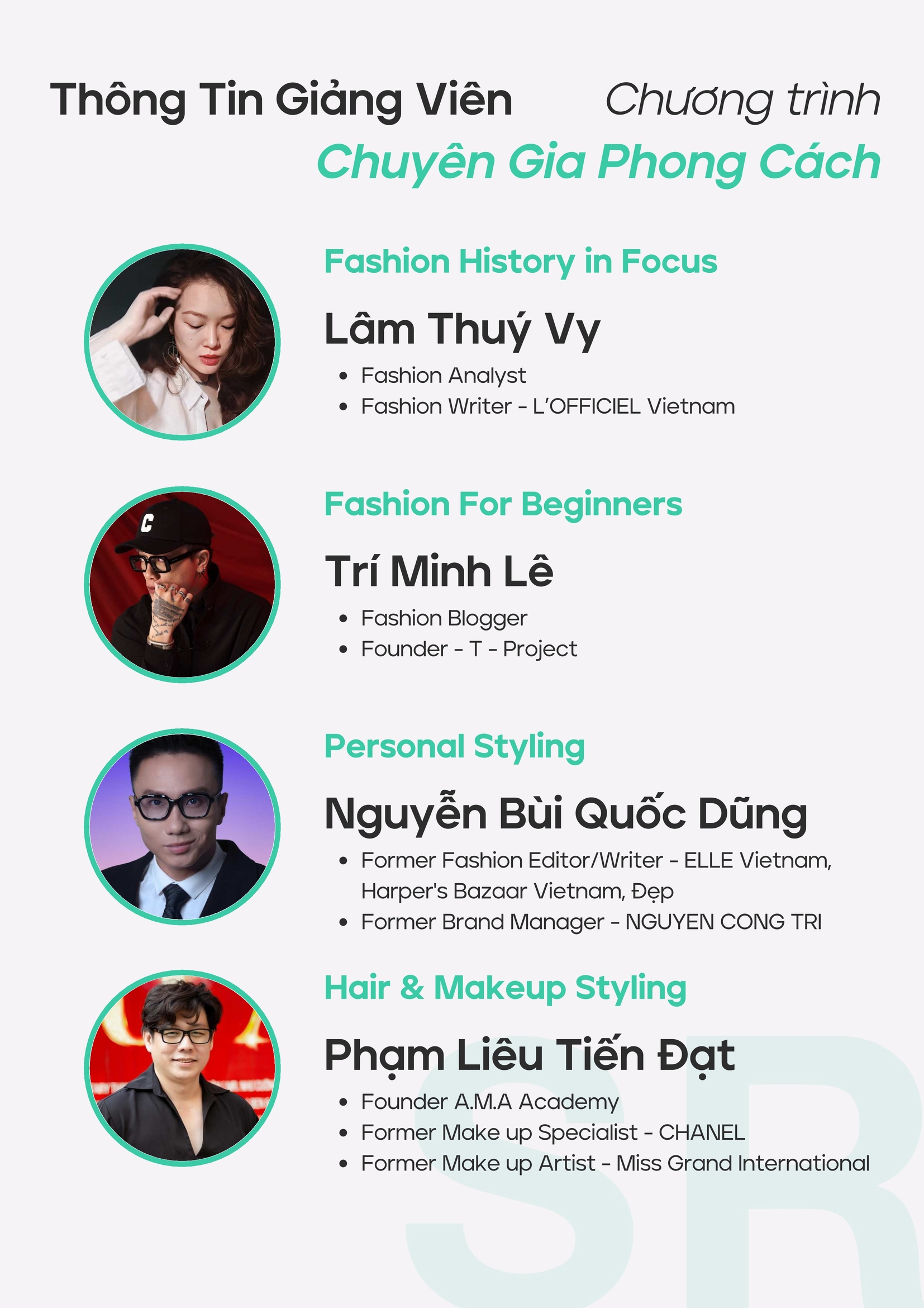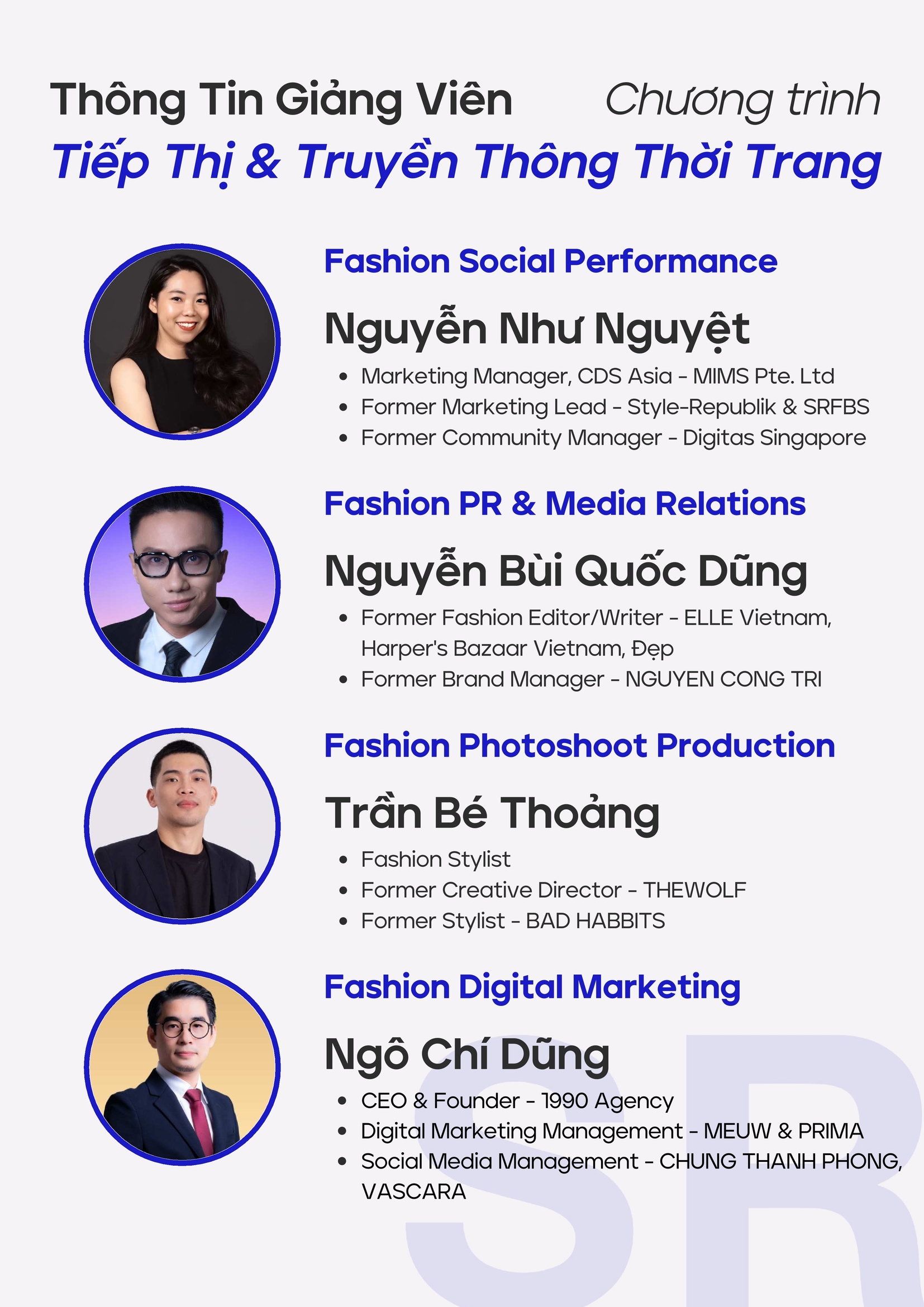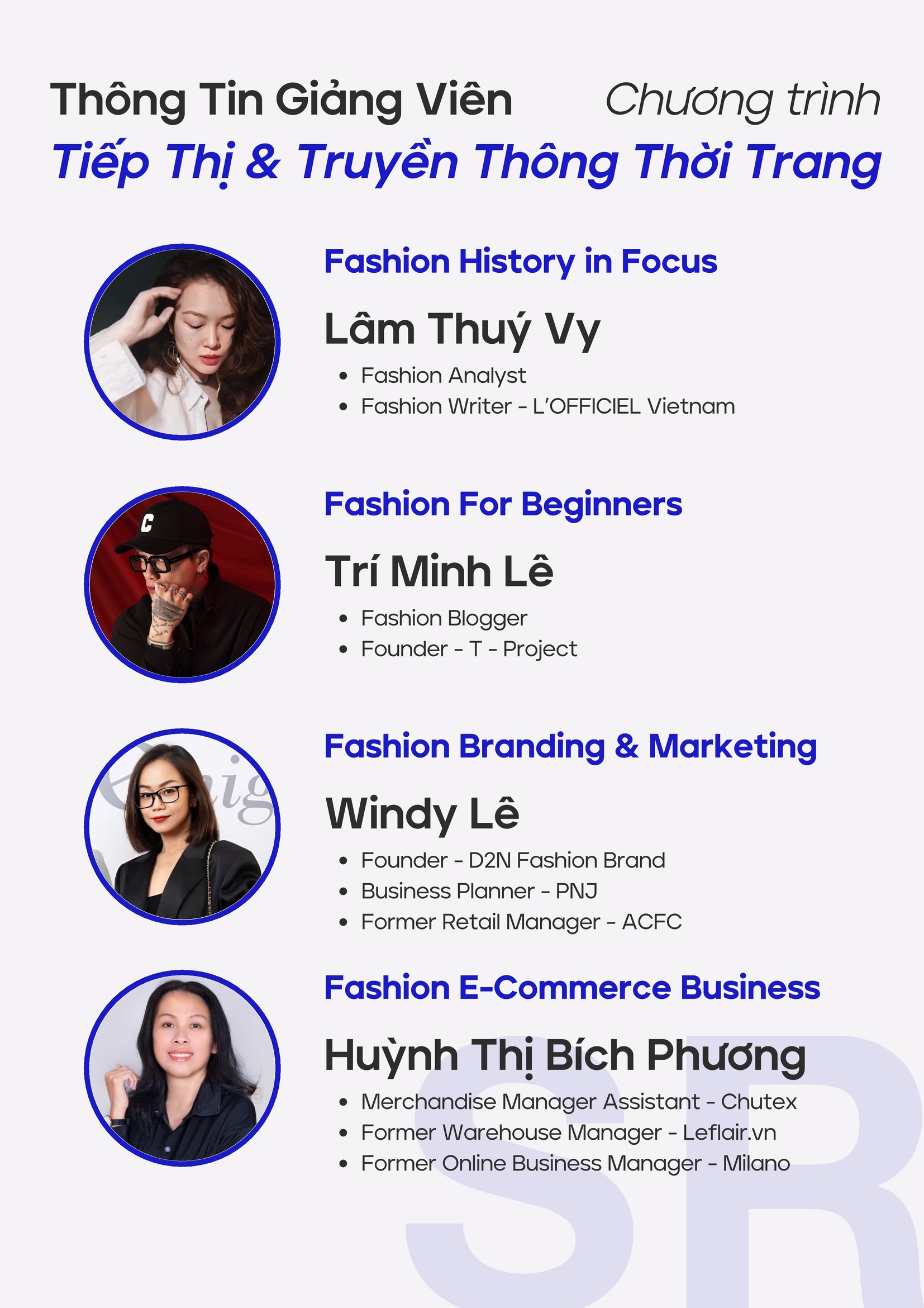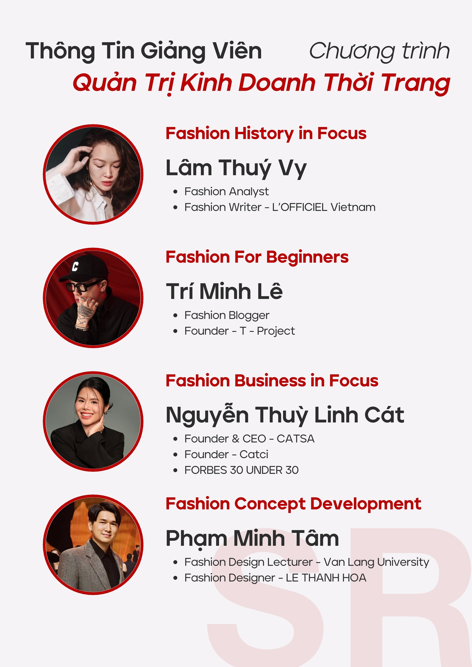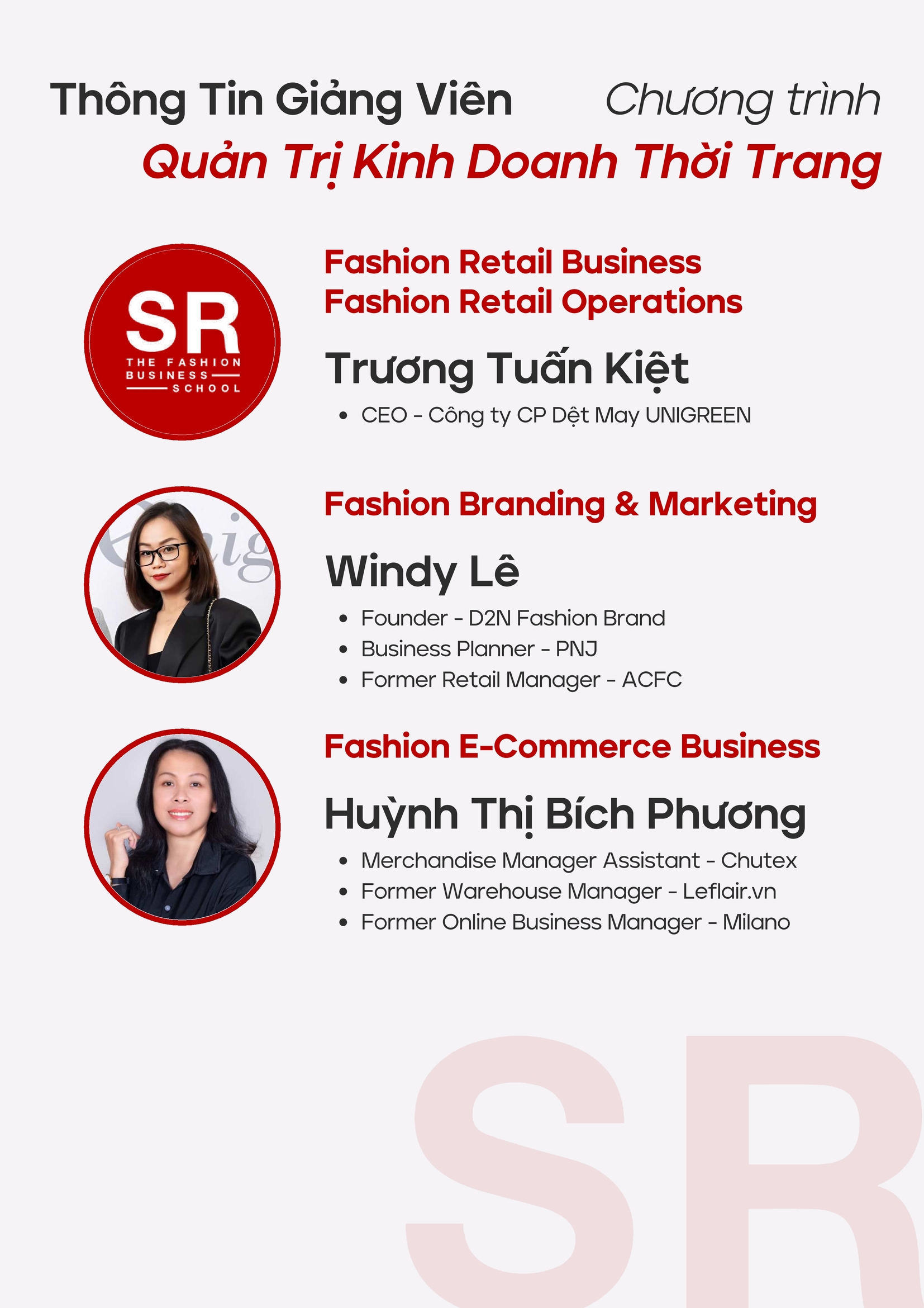 SR Fashion Business School tập hợp các giảng viên là chuyên gia đang làm việc trong lĩnh vực thời trang để tổ chức giảng dạy và chia sẻ kinh nghiệm thực tế nhằm mang lại những kiến thức và kỹ năng kinh doanh thời trang bài bản để học viên có thể áp dụng ngay vào ý tưởng xây dựng thương hiệu riêng, hoặc trở thành nhân sự tiềm năng cho các thương hiệu thời trang lớn.